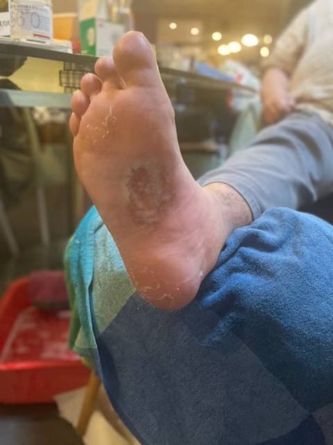 Mal perforant plantaire en cours de cicatrisation sous le pied droit