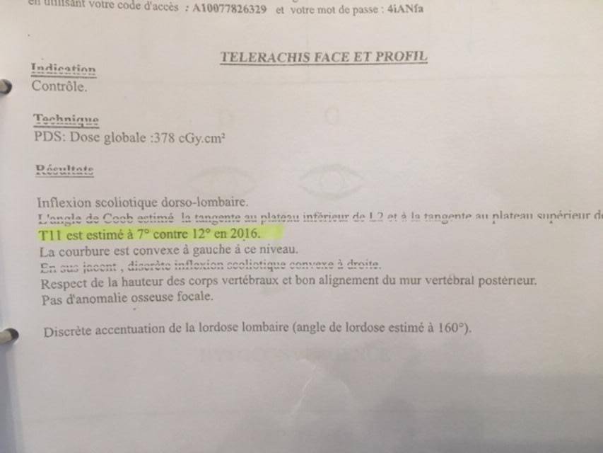 L’examen radiologique effectué en décembre 2018 (télérachis face et profil) indique un angle de Cobb (tangente L2 / T11) est maintenant estimé à 7° contre 12° lors de l’examen précédent.