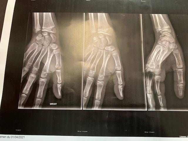 Le patient, un jeune sportif, présentait une fracture de la base de la deuxième phalange (P2) du pouce droit, consécutive à une chute survenue lors d’un entraînement de handball. La lésion a été confirmée par la radiographie apportée le jour du rendez-vous.