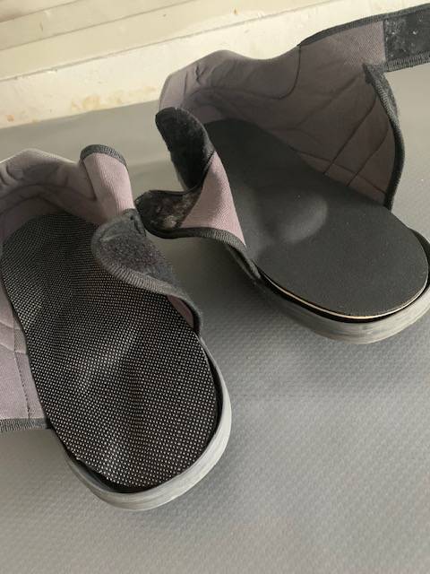 Ce patient porte des chaussures post opératoires très larges et réglables sur le dessus afin de pouvoir accueillir les pansements qui sont refaits régulièrement à l’hôpital depuis son opération.