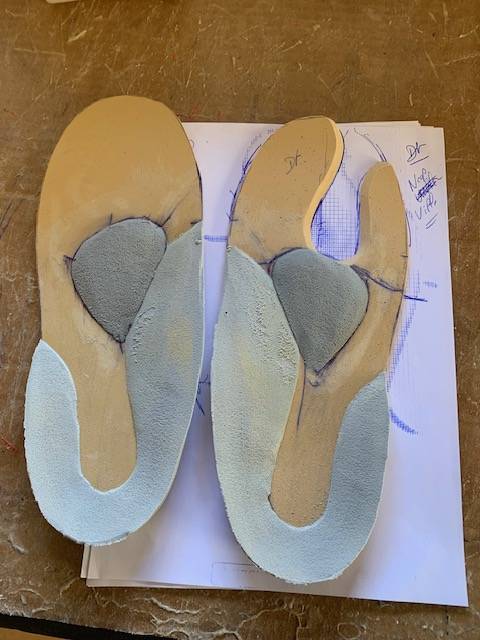 Un premier essayage a été réalisé afin de vérifier que les semelles sont bien adaptées aux chaussures post opératoires et que la zone de décharge élective est correctement positionnée.