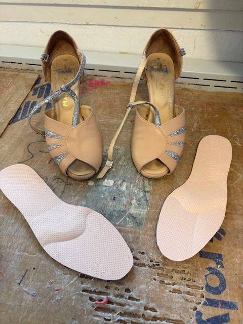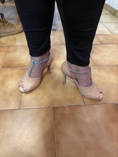 La patiente, chanteuse lyrique professionnelle, nous a confié ses chaussures de scène : des escarpins ouverts à lanières.